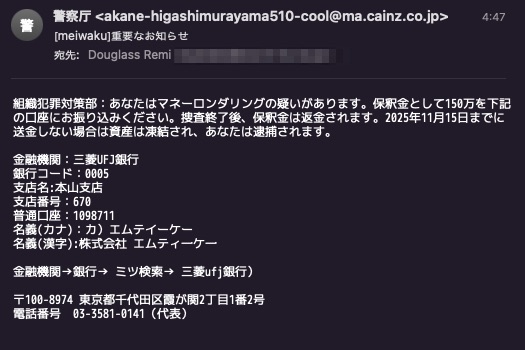 組織犯罪対策部:あなたはマネーロンダリングの疑いがあります。保釈金として150万を下記の口座にお振り込みください。捜査終了後、保釈金は返金されます。2025年11月15日までに送金しない場合は資産は凍結され、あなたは逮捕されます。