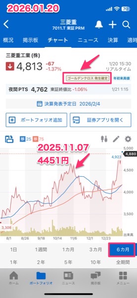 トランプ候補が暗殺未遂に遭遇して「確トラ」となった時に買った三菱重工ですが,その後植田ショックで買い増しして,ちょっと現金を作ろうと売ろうとしたら値段が高すぎて売れなかったのだけど,その後,株価も順調だし高市政権に入って防衛関連が熱い気がしたので買い増ししてみた.