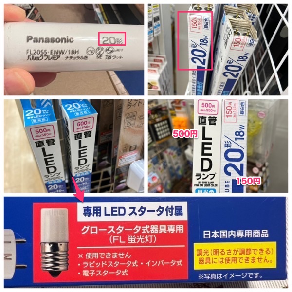 このダイソーには,従来型の蛍光灯150円と,直管LEDランプ500円が売られていた.グロー球が売られてなかったので,ダミーのグロー管がついているLED直管ランプにした.