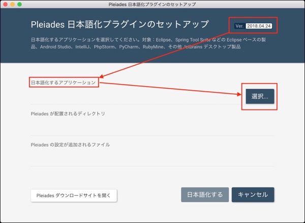 Eclipseとかと一緒になったPleiadesをダウンロードしてファイルを展開.setupアプリを起動して,日本語化したいアプリ,今回の場合はPyCharmを指定するだけ.