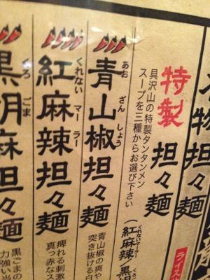 そんなものより一番辛い5つの唐辛子マークが付いている無頼漢担々麺を辛いもの好きのマンチェスター君が頼んだ.他の担々麺の説明書きは「まろやかでコクがありマイルドな辛さ」「丸ごとトマトが入った酸味の利いたタンタンメン」等と説明してあるけれど,無頼漢は違う.