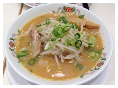 麺の上には,もやし,刻み葱がのっていてチャーシューの上にあるのはニンニク.スープはサッポロ一番みそらーめんの味がした.それが悪いと言っているわけではなくてね. ノリもいっぱい付いているので,白ネギ,青ネギなどを絡めて味を変えながら食べると色々と楽しめますね.