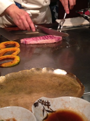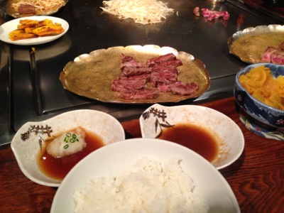 定食には,御飯とソースが2種類,和風と甘いステーキソース,メインの肉,それにモヤシを焼いてくれます.偶然写真に写っているカボチャは,隣の酔っぱらいが注文したものです.
