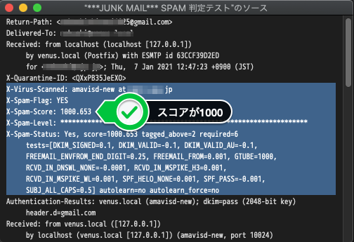 通過しているメールサーバがブラックリストに登録されている事が確認できる