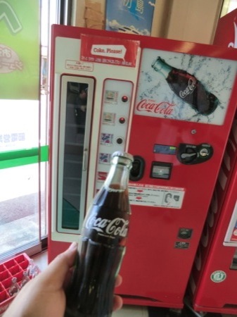 昔のコーラ瓶対応自動販売機は,「コイン投入後,好きな瓶を一本だけ引き出す」のですが,現在形は「コイン投入後,欲しい商品のボタンを押すと瓶が転がり出てくるのでそれを取りだす」というパターンです.ちょっとちがうし昔は500ccを売っていたと思うけれど,180cc瓶が110円だったのでリーズナブルで美味しい間に飲み干せるので良かったな.