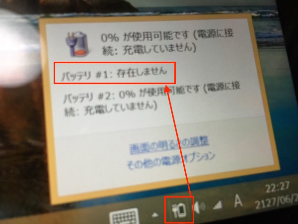 タスクバーの通知にはこのようにある通り,電源がつながっていることは認識されているが充電されてないということになる.