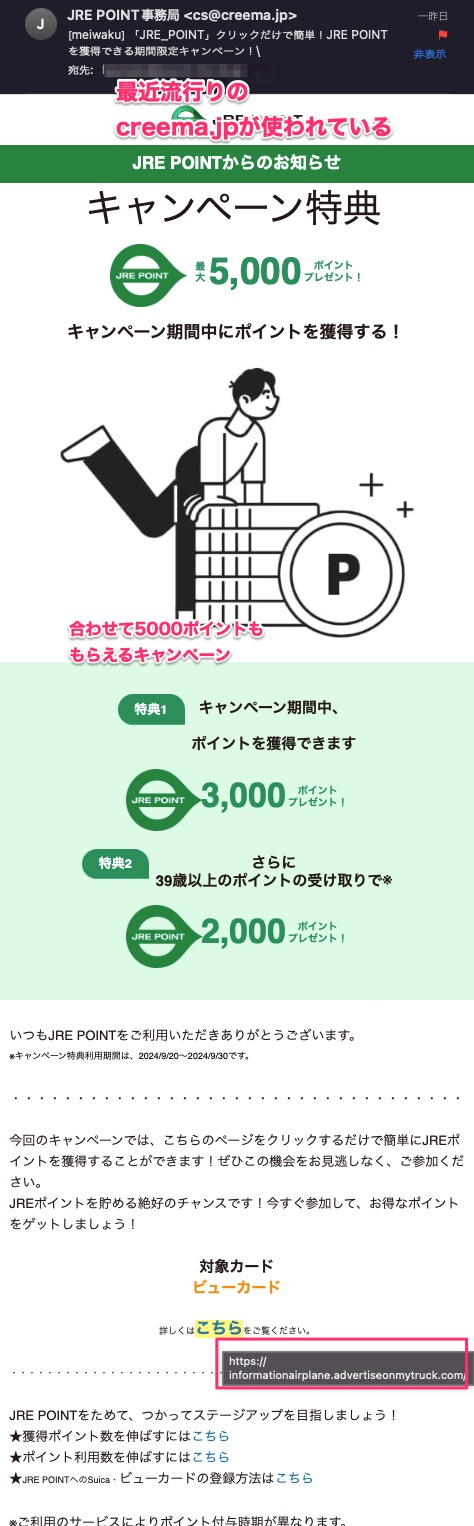 キャンペーン中のようで,このメールがたくさんくる.誘導先FQDNにアクセスしてもテイクダウンされているけど.