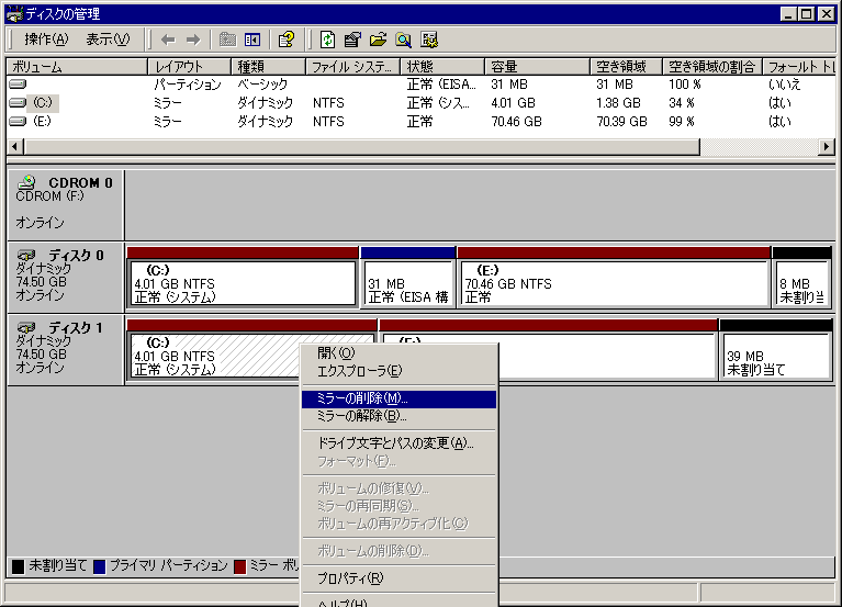 - ディスク1にあるミラー先のボリュームを選択して,右クリックする.
