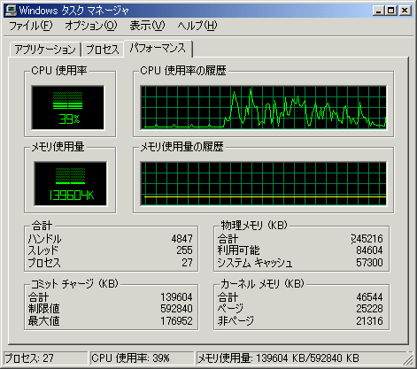 - つまり,前出の文書で確認したように,このマシンでは,360MBのページングファイルを使っているので,物理メモリとあわせて240MB+360MB-20MB=580MBが,OSやアプリケーションによって利用できるメモリ容量となる.
