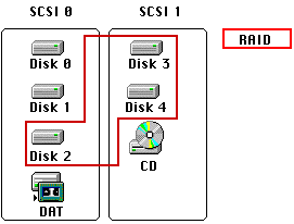 今回RAID構成が崩れたのは,図3のDisk2であるが,これはDATドライブが載っているSCSIコントローラ0系統と同じ部分に配置してある.