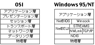 Windowsのネットワークでは,NetWareやNetBEUI,TCP/IPを次のような階層構造で組み立てている.