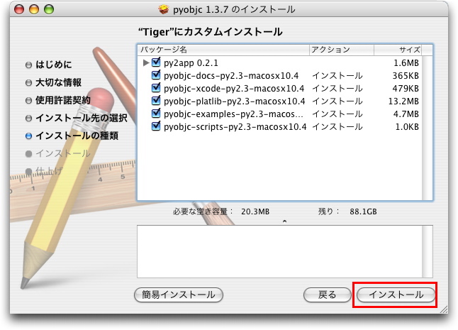 10.4.11で,Xcodeがインストールされており,PythonはインストールされているがPyObjCは無いのでインストールする.