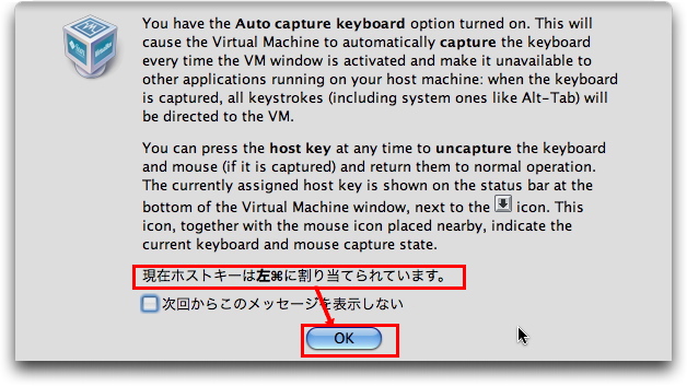 - これは左コマンドキーを押す事によって,キーボードおよびマウス操作がホストOS(MacOS)に戻ってくるというインフォメーションである.