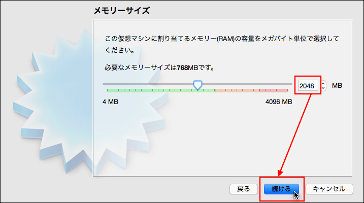 今回は物理マシンが4GBなので,その半分の2GBとしてみる.