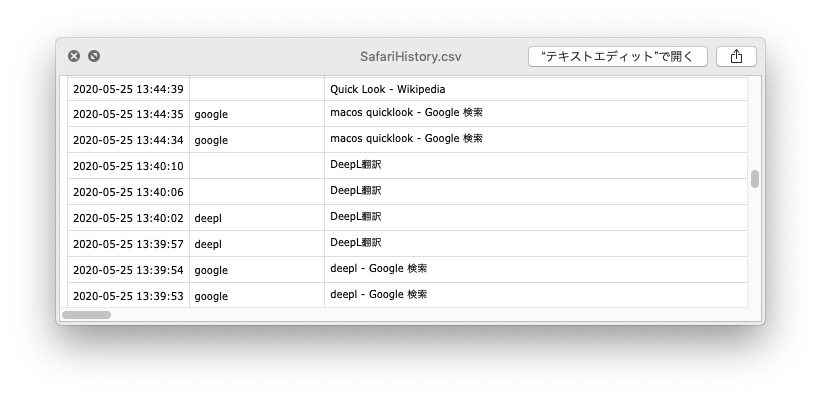 CSVファイルに,Safariの履歴が保存されていることが確認できる.